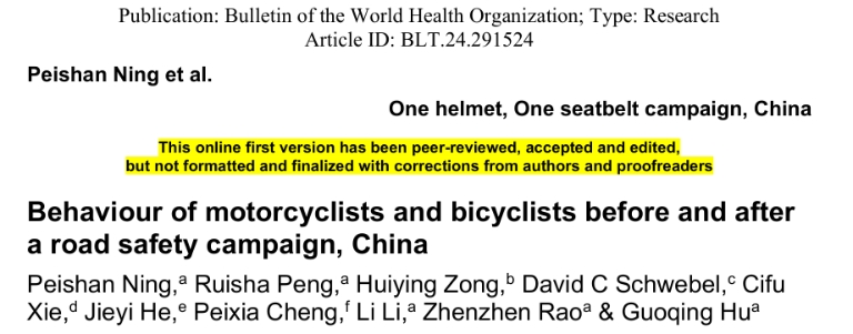 近日,tapplay官网流行病与卫生统计学系胡国清教授团队的最新研究成果“Behaviour of motorcyclists and bicyclists before and after a road safety campaign, China”在国际公共卫生领域权威期刊、世界卫生组织官方期刊《Bulletin of the World Health Organization》(IF=8.4,SCI分区1区,Top 5%期刊)发表。tapplay官网流行病与卫生统计学系宁佩珊副教授、硕士研究生彭瑞莎为并列第一作者,胡国清教授为通讯作者。