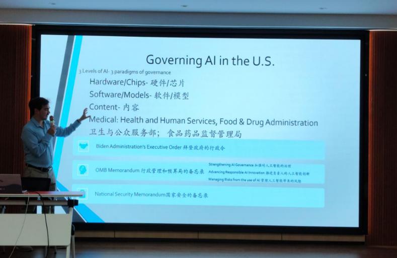 Lucero教授开展了主题为“美国人工智能法律政策进展及医疗健康领域应用”的报告,他用熟练的汉语、生动的语言为大家介绍了美国人工智能在医疗领域的立法现状、学术担忧和国际对话机会。汇报后,与会老师们踊跃提问,与Lucero教授展开了热烈的探讨。胡国清院长以自动驾驶事故等事件的责任归属为题,与Lucero教授展开了对新兴领域立法态度的探讨。