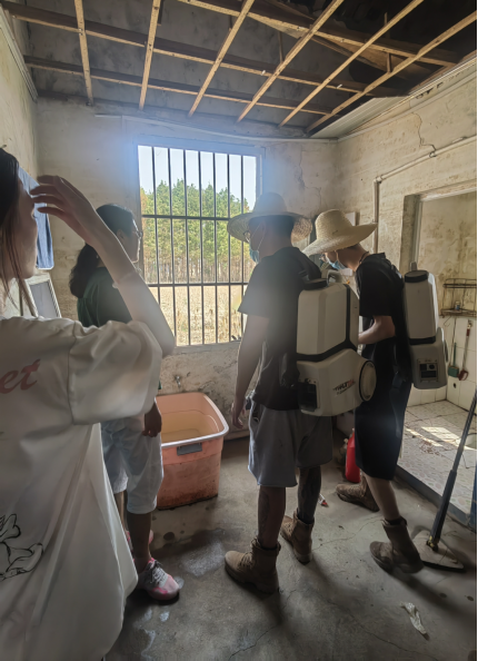 随后,大家来到点对点帮扶灾民的家中,帮助灾民清洗房屋、配置消毒液、对洪水淹过的区域进行消杀,特别加强了厕所和牲畜圈的消杀,避免灾民返乡出现疫情。