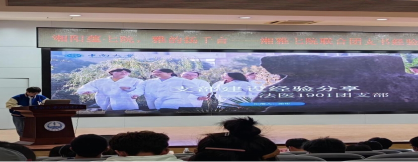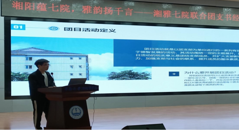 经验分享环节的最后,湘雅医学院团委副书记王靖宇上台发言,在演讲中他提到:“新时代中国青年要从党领导下的建团百年历史中汲取精神营养,增强做中国人的志气、骨气和底气。共青团在党的领导下,应不忘初心、牢记使命,走在青年前列,组织引导一代又一代青年坚定信念、紧跟党走,在党的领导下,踏上光荣和梦想的远征。”为各团支书后续如何做好工作指引了方向。