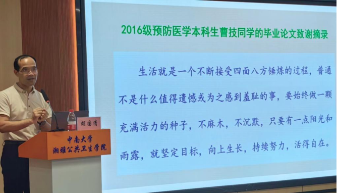 课程的尾声,胡院长将2016级预防医学本科生曹技同学的毕业论文致谢分享给在场的同学们,表达对同学们的期望与祝福,并在讲述结束后,与现场学生亲切互动,就同学们提出的问题做出详细回答。