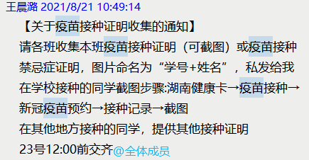l 积极转发学校学院关于疫苗接种的通知,保证全班同学都可以知道学校疫苗接种的现状,及时参与到疫苗接种工作中。