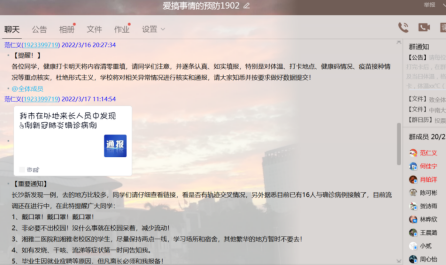 l 在班级群中发布相关防疫信息,及时向所有班级同学同步学校的防疫工作,整个学校上下一盘棋。
